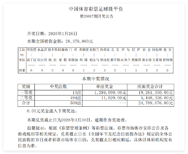 北京时间1月26日,足彩第26017期开奖结果揭晓。本期14场1等开出15注,单注奖金128万元,此前654万滚存被清空;14场2等开出494注,单注奖金11029元;任九开出2180注,单注奖金6141元。本期14场销量为28,379,060元,任九总投注额为20,918,212元。