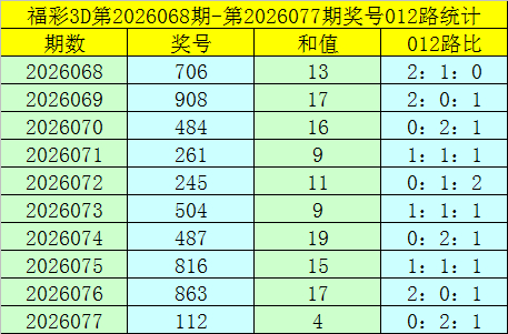 上期转头:福彩3D第2026077期开出奖号:112。奖号为组三口头,与试机号莫得同,奇偶比为2:1,大小比为0:3,012路比为0:2:1,和值为4,跨度为1。