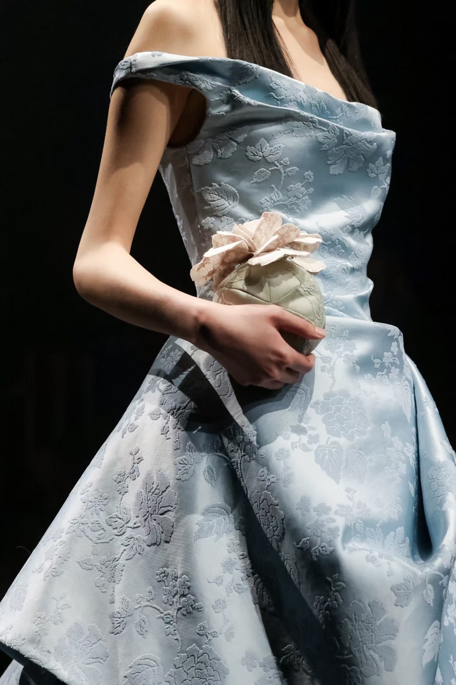 两者一纠合,产生了出东说念主预料的成果。模特穿着漳缎高定治服走T台。舞台配景是用皮影透光,照耀出金山农民画飞鸟和枝桠元素;治服上更是将中国传统“花”元素用当代时间拆解,花瓣立体绽开。既有江南的温婉,又有一股子从地盘里长出来的生命力。现场嘉宾纷纷掏脱手机狂拍。