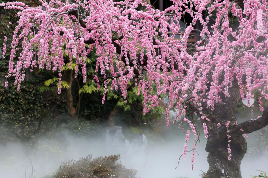 11.蘑力梅景:宽达8米的垂枝梅横展如云,梅香浸石,落英缀岩,造化偶得此柔刚共栖奇景。