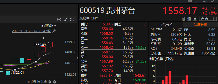 贵州茅台当天小幅低开后,盘中逆势拉升,法律阐扬发稿,高涨2.26%,最新股价报1559.46元/股,成交额超60亿元,总市值重新站上2万亿元。