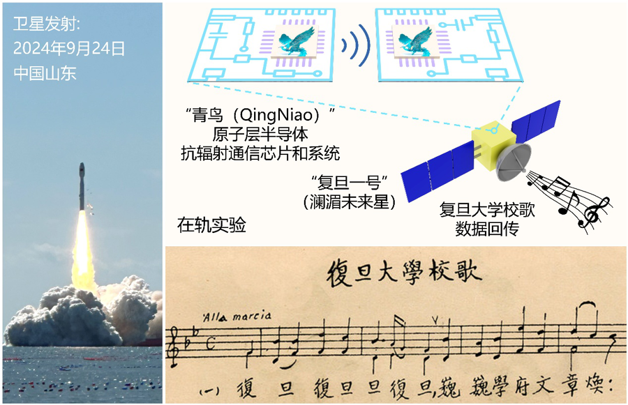 团队基于单层原子厚度的二硫化钼设计出了抗辐射射频通信系统,即“青鸟”系统,并实现了4英寸晶圆级流片,能够应用于星载通信。2024年9月24日,搭载着“青鸟”系统的“复旦一号”卫星在中国山东发射升空,进入距地球约517公里的低地球轨道。