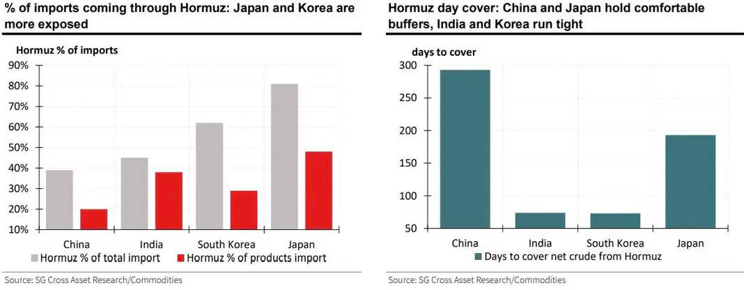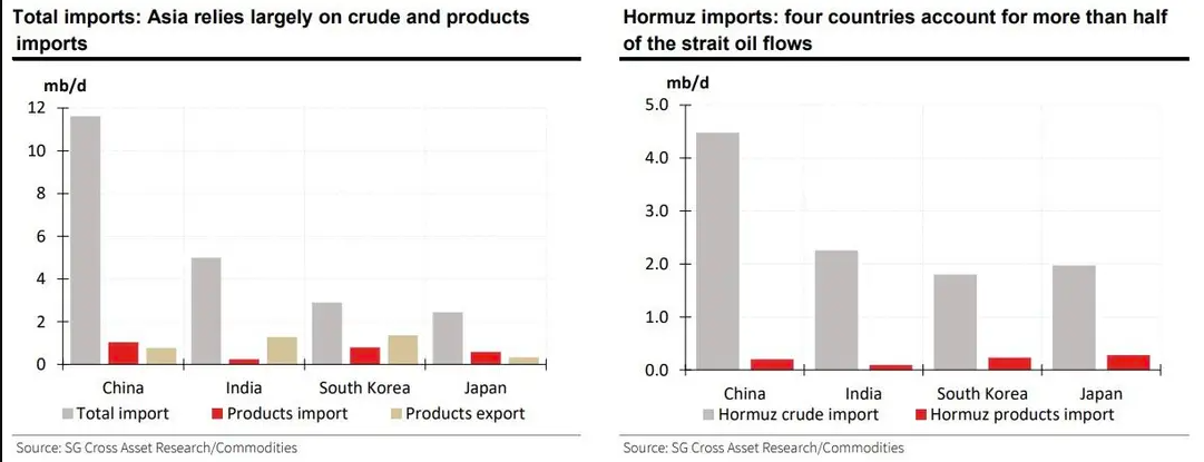 法国兴业银行指出,亚洲经济体靠近的问题可能更为严峻,因为该地区通过霍尔木兹海峡的入口量跳跃1300万桶/日——约占该地区总入口量的50%,其中中国、印度、韩国和日本是四个最大的买家。