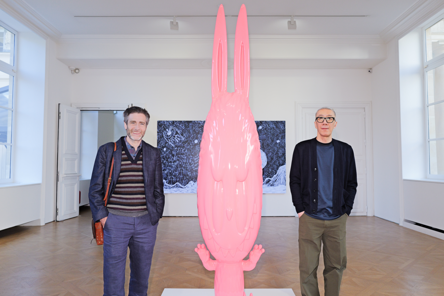 THE MONSTERS艺术家龙家升(右)与《帕丁顿熊》系列电影导演保罗·金(左)在THE MONSTERS十周年全球巡展巴黎站合影。受访者供图