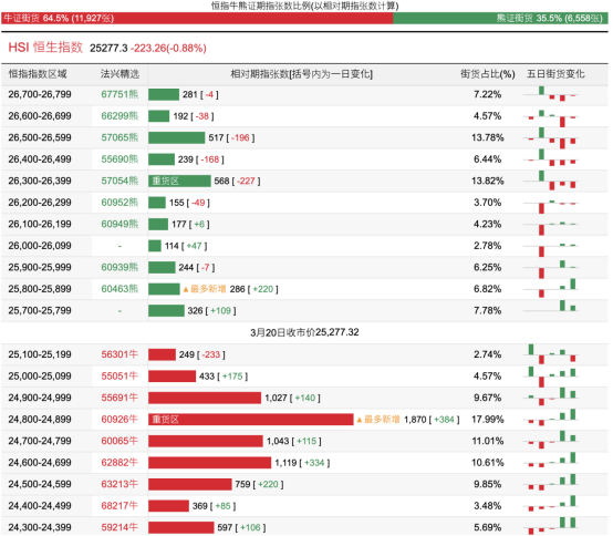 万生优配以前5日,恒指牛证筹谋约1287万港元资金净流入;恒指熊证则筹谋约7055万港元资金净流出。街货散播方面,恒指牛证街货占比约64.5%,散播在收回价24800点至25200点之间,累计十分约3579张期指合约;恒指熊证街货在收回价25700点至26400点之间,累计十分约1870张期指合约。