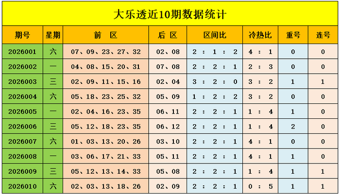 上期回顾:大乐透第2026010期奖号为:前区02、03、13、18、26,后区02、09,前区奖号三区比为2:2:1,冷热比为0:5,后区开出小大组合02、09