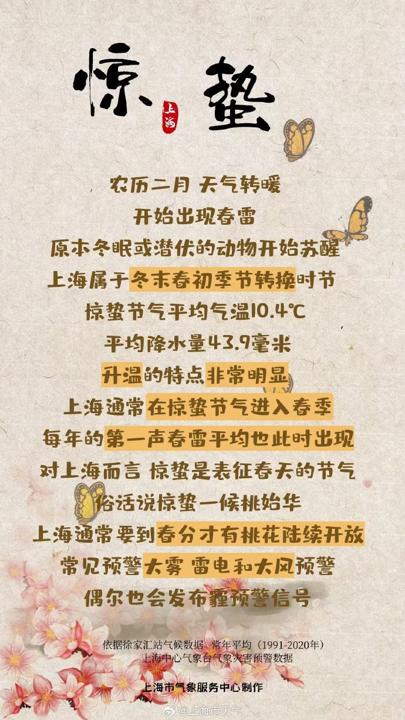 今天迎来二十四气节中的第三个气节——“惊蛰”。正所谓“春雷响,万物长”,此时节天气转暖,渐有春雷,蛰伏的动物也启动苏醒。关于刚刚经验了漫长灰暗天的申城来说,这个“惊蛰”相等应景,抓续多日的连灰暗终于要画上句号了。