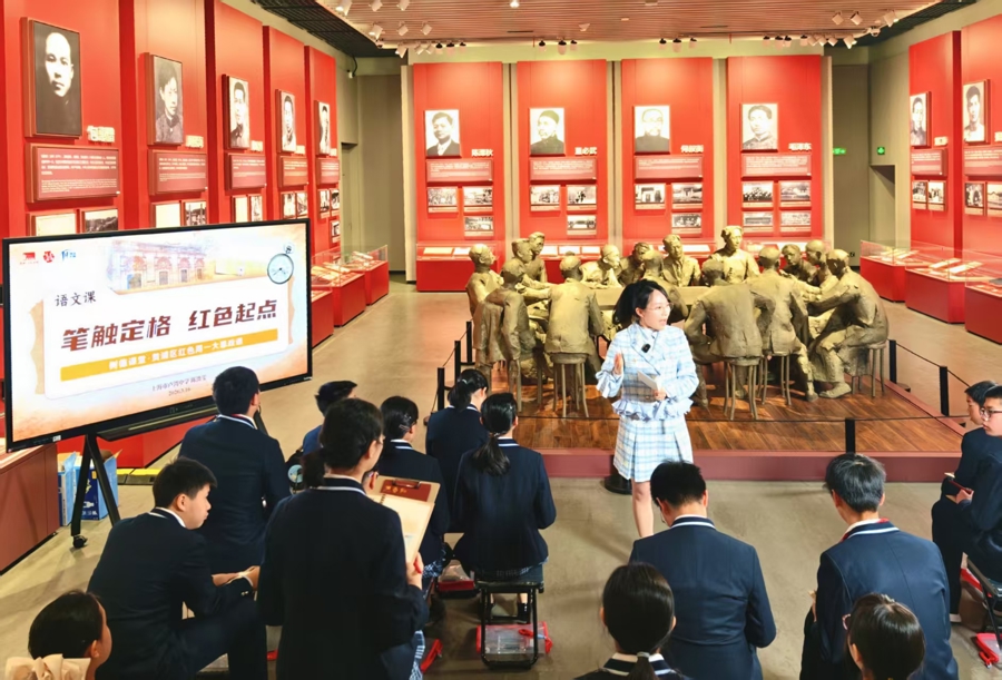 上昼8时30分,国旗在中共一大哀悼馆广场飞腾起,上海市卢湾中学的七年事学生身着治服,向国旗敬礼。上昼9时,摇铃声响,艺术、历史、谈德与法治、语文等4个千里浸式课堂,向同学们张舒怀抱。