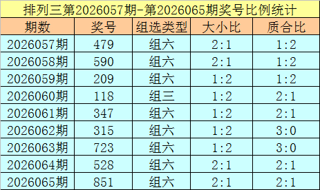 上期回来:摆设三第2026065奖号开出851,奖号质合比为2:1,大小比为2:1,跨度为7,类型为组六。
