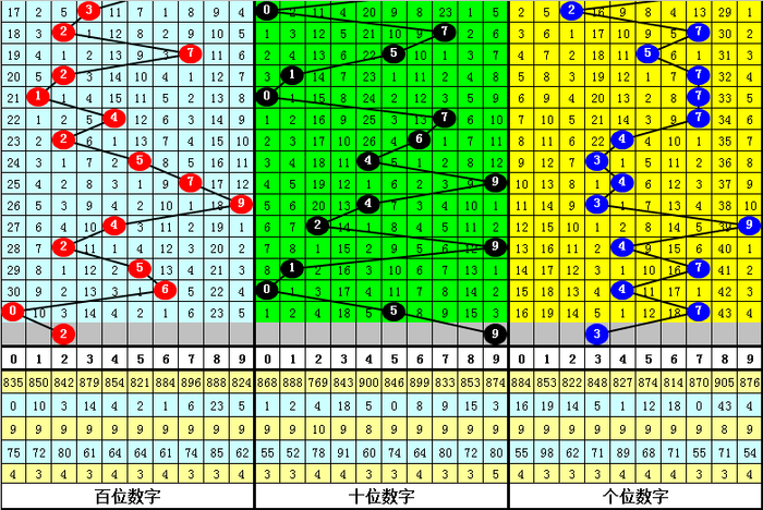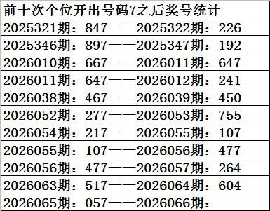 四、个位分析:上期开出号码7,前10次号码7出现之后下期同位号码为:6271057744,其中号码大小比为5:5,尽头;奇偶比为5:5,尽头;012路比为2:6:2,0路号码发扬相对较冷。本期参考号码:3。