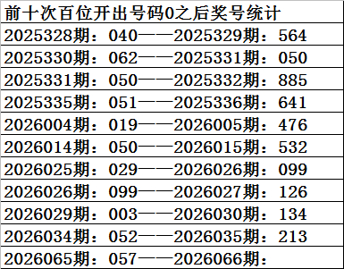 一、上期开奖:福利彩票3D第2026065期奖号为057。奇偶比为2:1,大小比为:2:1,奖号和值为12,奖号跨度为7。