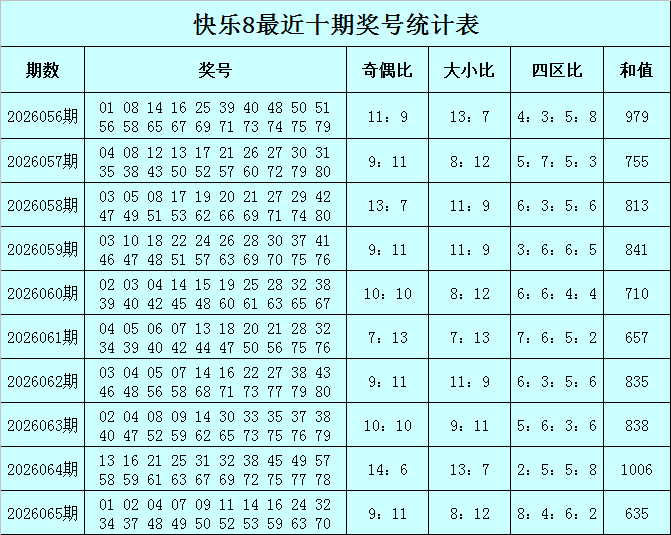 福彩孤高8第2026065期开奖归来:01 02 04 07 09 11 14 16 24 32 34 37 48 49 50 52 53 59 63 70,其中奖号四区比为8:4:6:2,奇偶比为9:11,大小比为8:12,和值为635。