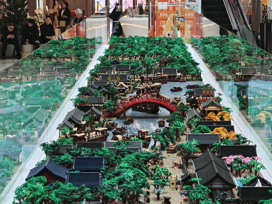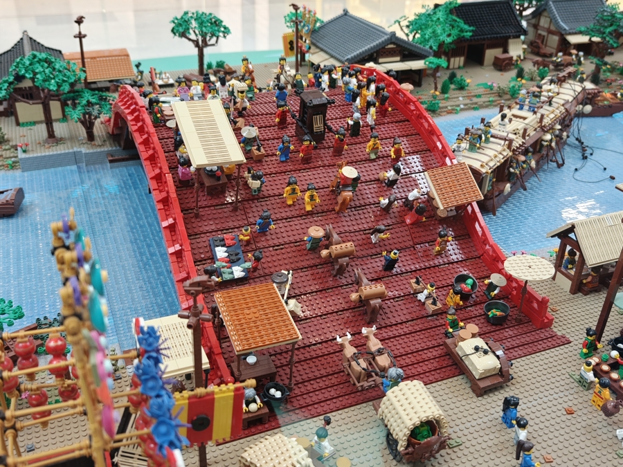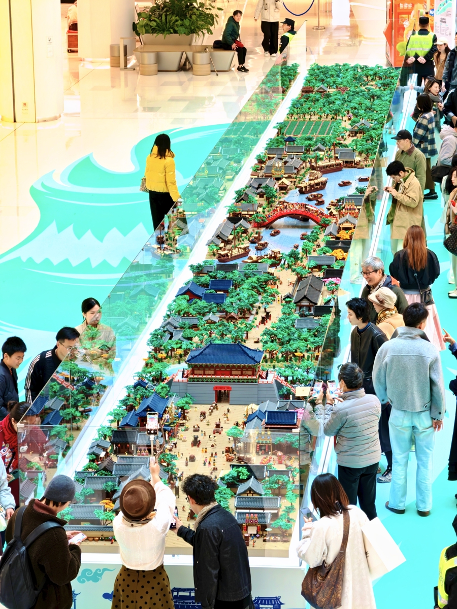 图为中信泰富广场展出全长26.5米的乐高实景装配《辉煌上河图》招引市民参不雅